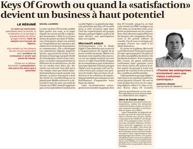 L'écho, 15/04/2017. http://www.lecho.be/actualite/archive/Keys-Of-Growth-ou-quand-la-satisfaction-devient-un-business-a-haut-potentiel/9883442?ckc=1&ts=1492518064